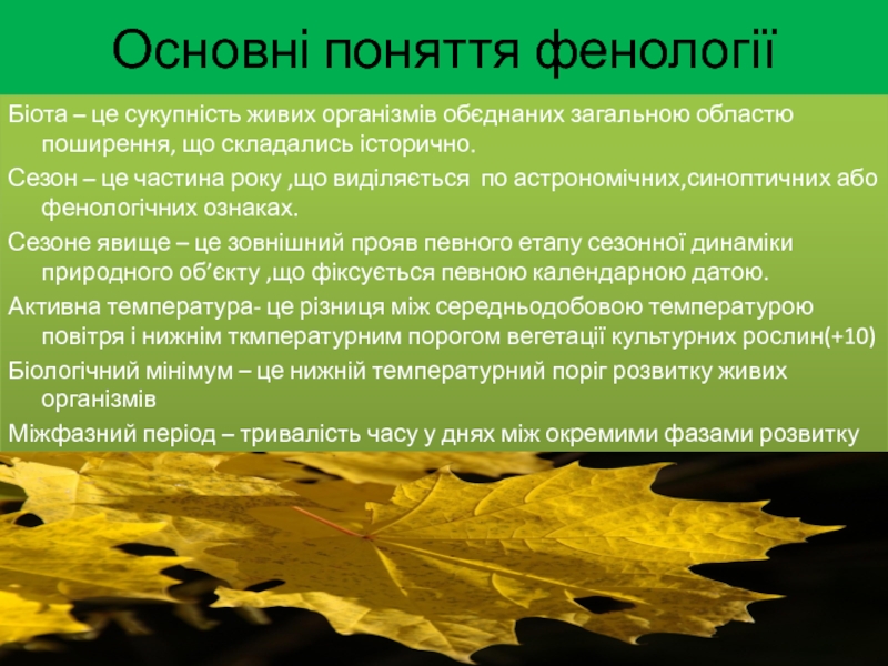 Основні поняття фенологіїБіота – це сукупність живих організмів обєднаних загальною областю поширення, що складались історично.Сезон – це