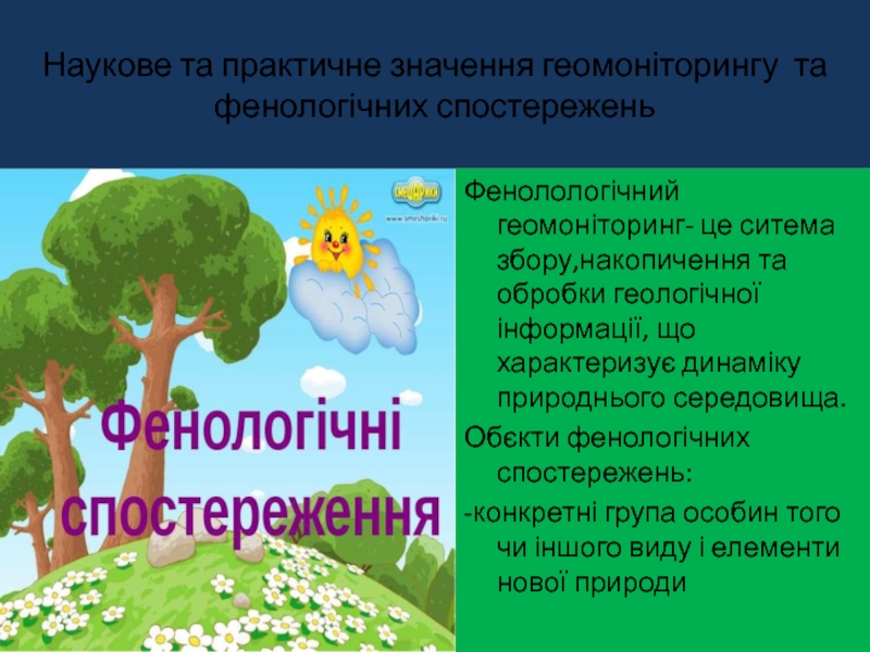 Наукове та практичне значення геомоніторингу та фенологічних спостереженьФенолологічний геомоніторинг- це ситема збору,накопичення та обробки геологічної інформації, що характеризує динаміку природнього середовища.Обєкти фенологічних спостережень: -конкретні група особин того чи іншого виду і