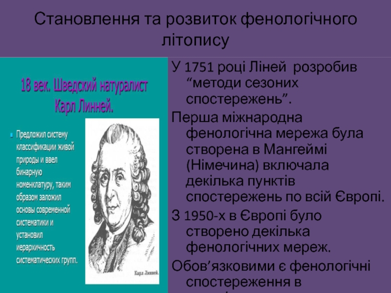 Становлення та розвиток фенологічного літописуУ 1751 році Ліней розробив “методи сезоних спостережень”.Перша міжнародна фенологічна мережа була створена