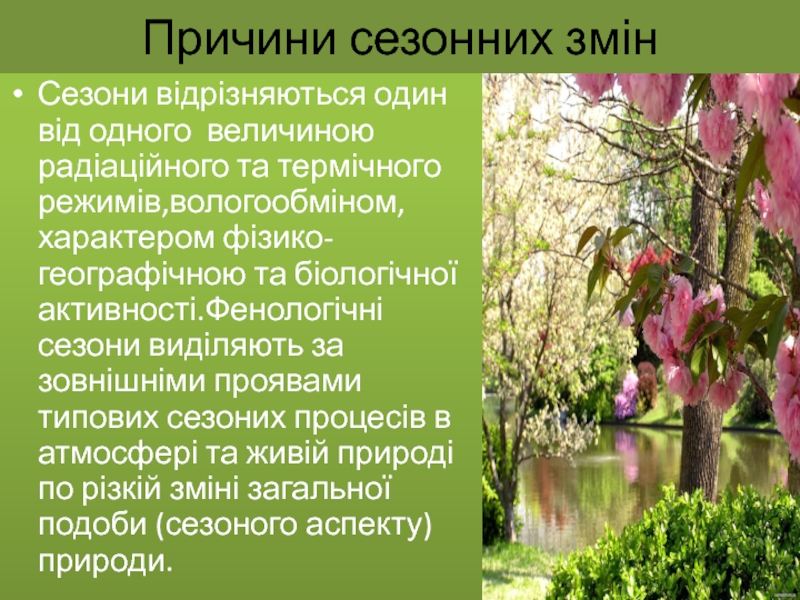 Причини сезонних змінСезони відрізняються один від одного величиною радіаційного та термічного режимів,вологообміном,характером фізико- географічною та біологічної активності.Фенологічні