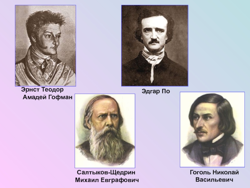 Эрнст Теодор Амадей Гофман Эдгар По Салтыков-Щедрин Михаил Евграфович Гоголь НиколайВасильевич