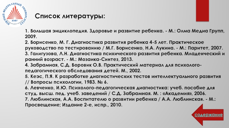 6. Левченко, И.Ю. Психолого-педагогическая диагностика: учеб. пособие для студ. высш. пед. учеб. заведений / С.Д. Забрамная. М. : «Академия», 2006.