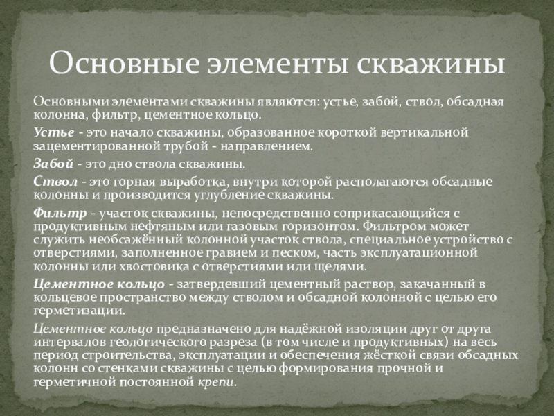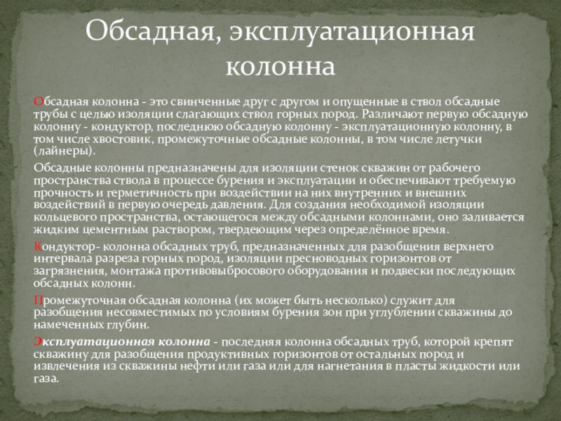 Эксплуатационная колонна - последняя колонна обсадных труб, которой крепят скважину для разобщения продуктивных горизонтов от остальных пород и извлечения из скважины нефти или газа или для нагнетания в пласты жидкости или газа.