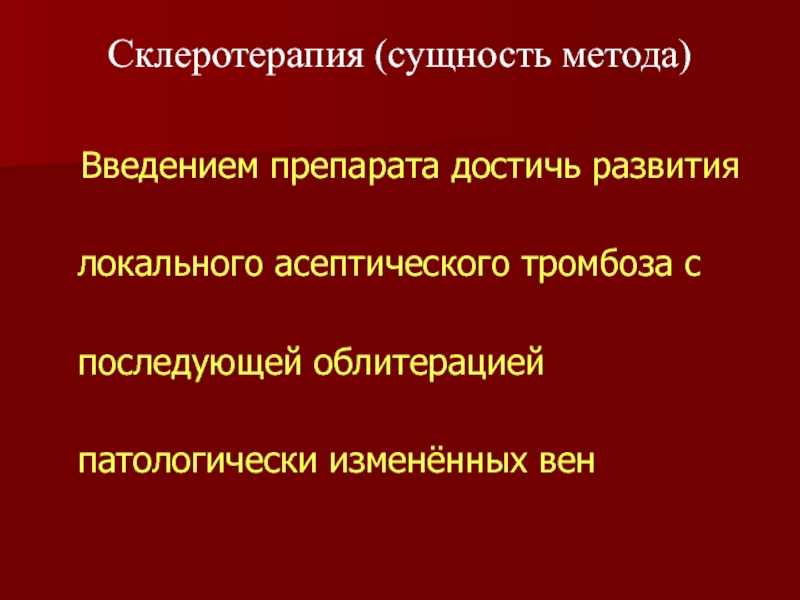 Слайд 60Введением препарата достичь развития локального асептического тромбоза с последующей облитерацией