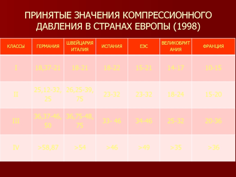 ПРИНЯТЫЕ ЗНАЧЕНИЯ КОМПРЕССИОННОГО ДАВЛЕНИЯ В СТРАНАХ ЕВРОПЫ (1998)