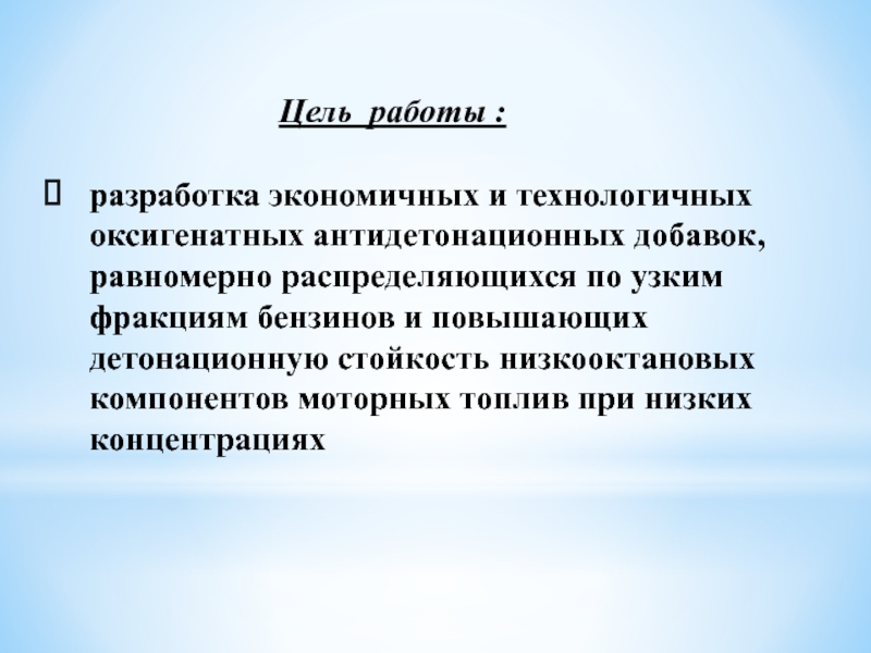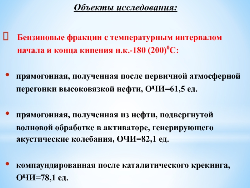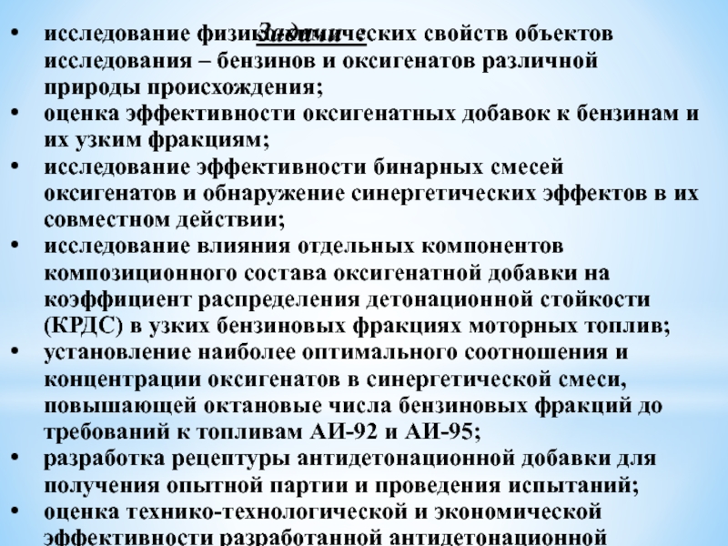 установление наиболее оптимального соотношения и концентрации оксигенатов в синергетической смеси, повышающей октановые числа бензиновых фракций до требований к топливам АИ-92 и АИ-95;