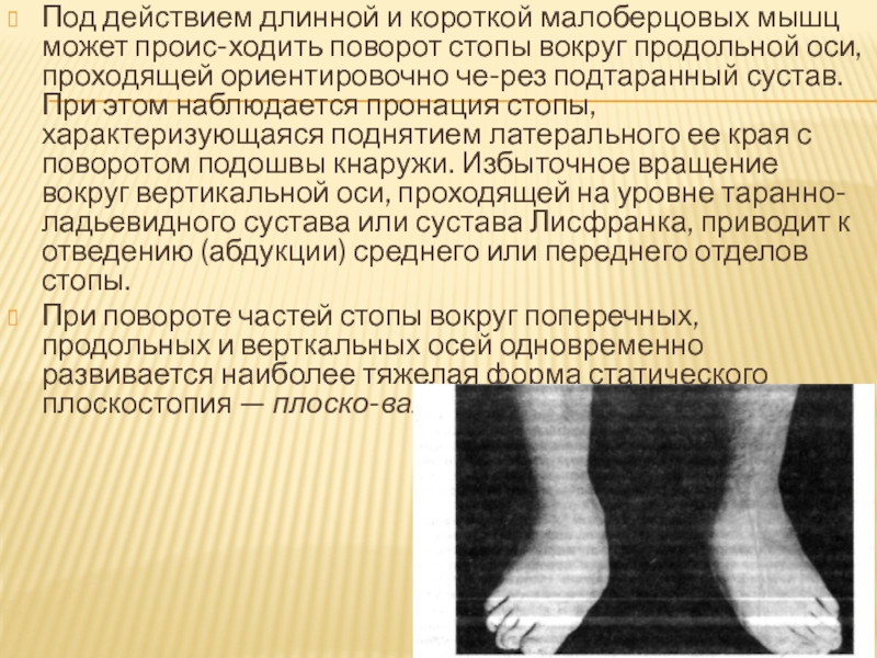 этом наблюдается пронация стопы, характеризующаяся поднятием латерального ее края с поворотом подошвы кнаружи. Избыточное вращение вокруг вертикальной оси, проходящей на уровне таранно-ладьевидного сустава или сустава Лисфранка, приводит к отведению (абдукции) среднего или переднего отделов стопы.