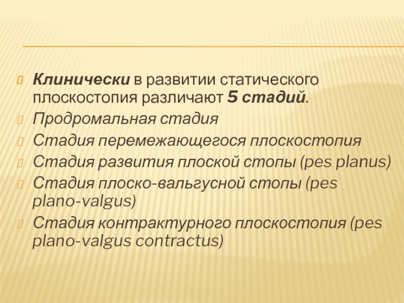 Слайд 15Клинически в развитии статического плоскостопия различают 5 стадий.