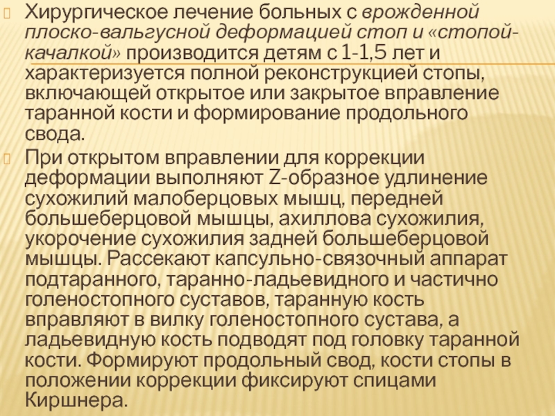 Слайд 24Хирургическое лечение больных с врожденной плоско-вальгусной деформацией стоп и «стопой-качалкой»