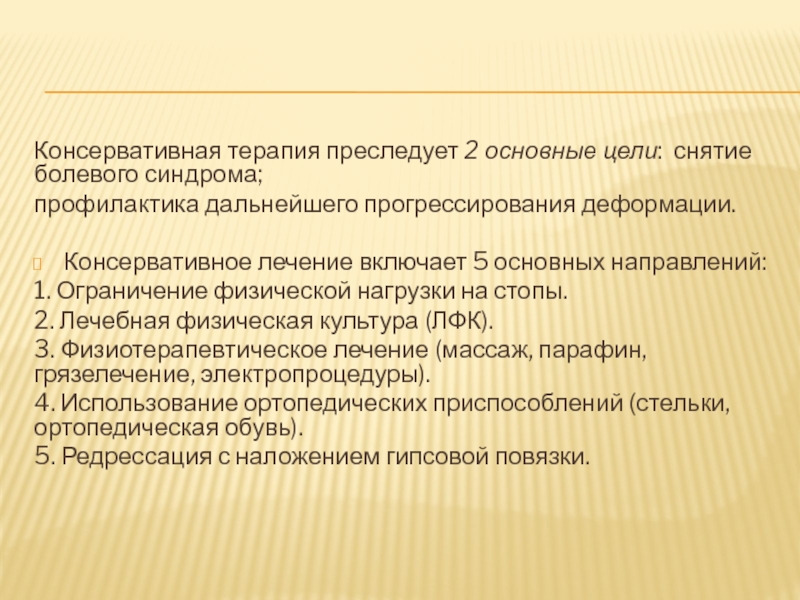 Слайд 21Консервативная терапия преследует 2 основные цели: снятие болевого синдрома;