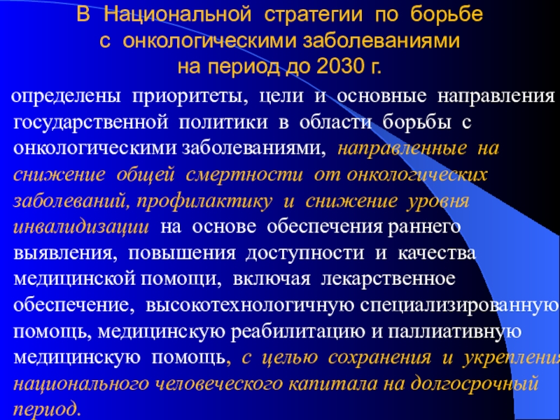 государственной политики в области борьбы с онкологическими заболеваниями, направленные на снижение общей смертности от онкологических заболеваний, профилактику и снижение уровня инвалидизации на основе обеспечения раннего выявления, повышения доступности и качества медицинской помощи, включая лекарственное обеспечение, высокотехнологичную специализированную помощь, медицинскую реабилитацию и паллиативную медицинскую помощь, с целью сохранения и укрепления национального человеческого капитала на долгосрочный период.