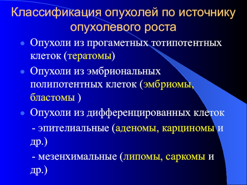 Слайд 2Классификация опухолей по источнику опухолевого роста