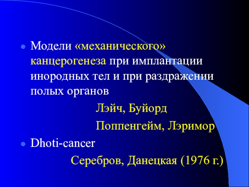 Слайд 13Модели «механического» канцерогенеза при имплантации инородных тел и при раздражении