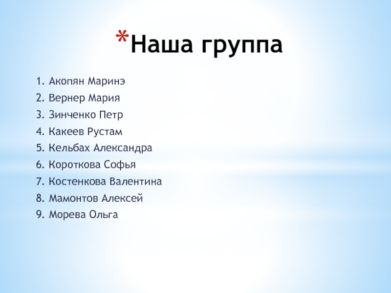 Наша группа1. Акопян Маринэ2. Вернер Мария3. Зинченко Петр4. Какеев Рустам5. Кельбах Александра6. Короткова Софья7. Костенкова Валентина8. Мамонтов