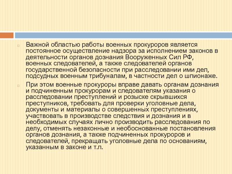 Слайд 17Важной областью работы военных прокуроров является постоянное осуществление надзора за
