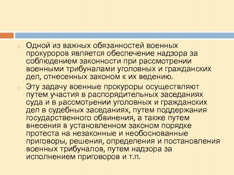 Слайд 13Одной из важных обязанностей военных прокуроров является обеспечение надзора за
