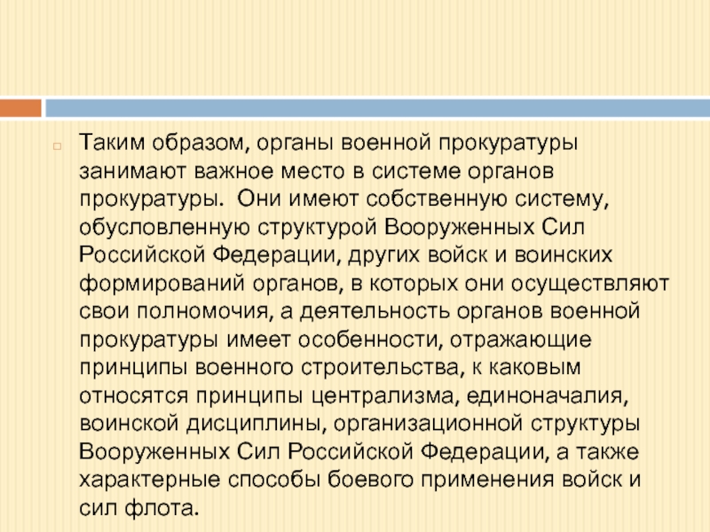 Российской Федерации, других войск и воинских формирований органов, в которых они осуществляют свои полномочия, а деятельность органов военной прокуратуры имеет особенности, отражающие принципы военного строительства, к каковым относятся принципы централизма, единоначалия, воинской дисциплины, организационной структуры Вооруженных Сил Российской Федерации, а также характерные способы боевого применения войск и сил флота.