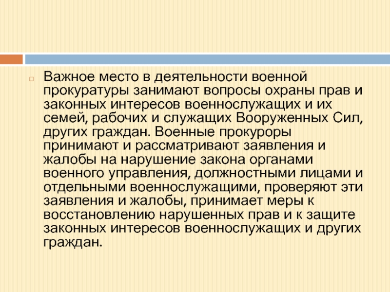 Вооруженных Сил, других граждан. Военные прокуроры принимают и рассматривают заявления и жалобы на нарушение закона органами военного управления, должностными лицами и отдельными военнослужащими, проверяют эти заявления и жалобы, принимает меры к восстановлению нарушенных прав и к защите законных интересов военнослужащих и других граждан.