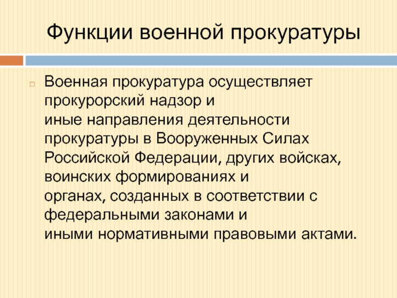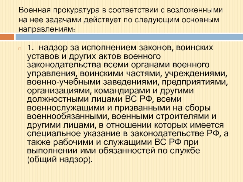 Слайд 10Военная прокуратура в соответствии с возложенными на нее задачами действует