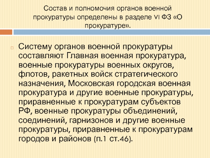 Слайд 3Состав и полномочия органов военной прокуратуры определены в разделе VI ФЗ «О прокуратуре».