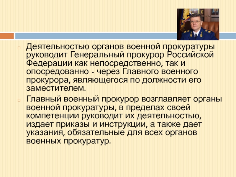 Слайд 8Деятельностью органов военной прокуратуры руководит Генеральный прокурор Российской Федерации как