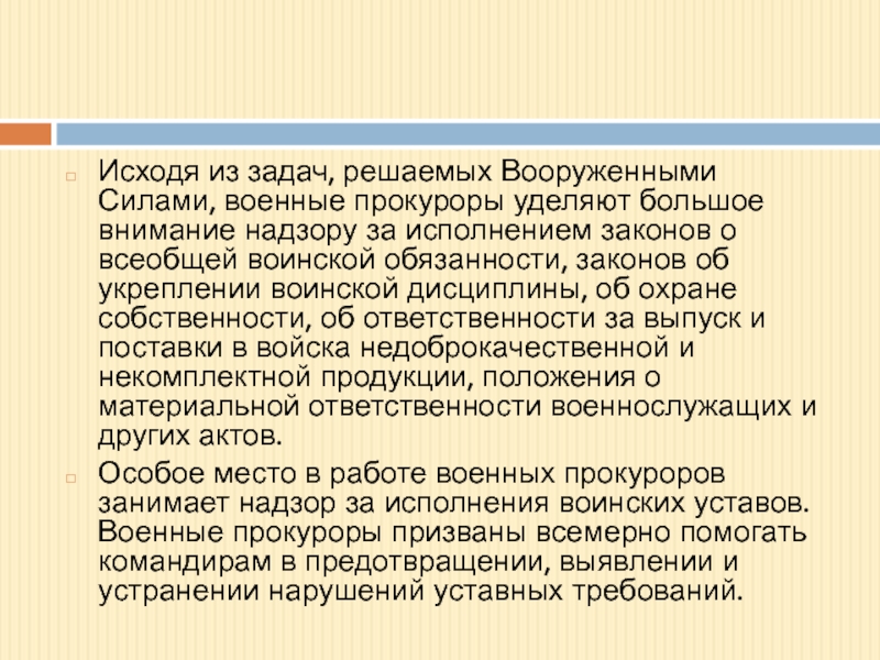 Слайд 16Исходя из задач, решаемых Вооруженными Силами, военные прокуроры уделяют большое