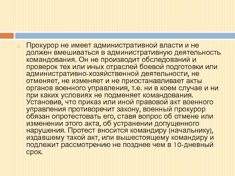 или иных отраслей боевой подготовки или административно-хозяйственной деятельности, не отменяет, не изменяет и не приостанавливает акты органов военного управления, т.е. ни в коем случае и ни при каких условиях не подменяет командования. Установив, что приказ или иной правовой акт военного управления противоречит закону, военный прокурор обязан опротестовать его, ставя вопрос об отмене или изменении этого акта, об устранении допущенного нарушения. Протест вносится командиру (начальнику), издавшему такой акт, или вышестоящему командиру и подлежит рассмотрению не позднее чем в 10-дневный срок.