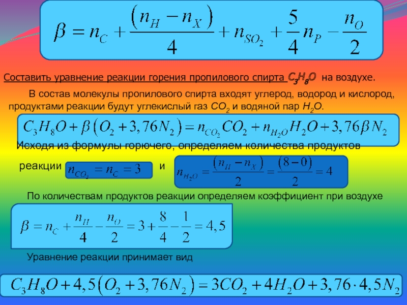 С3Н7ОН + 4,5(О2 + 3,76N2) =3СО2 + 4Н2О +4,53,76 N2 = 4,5.