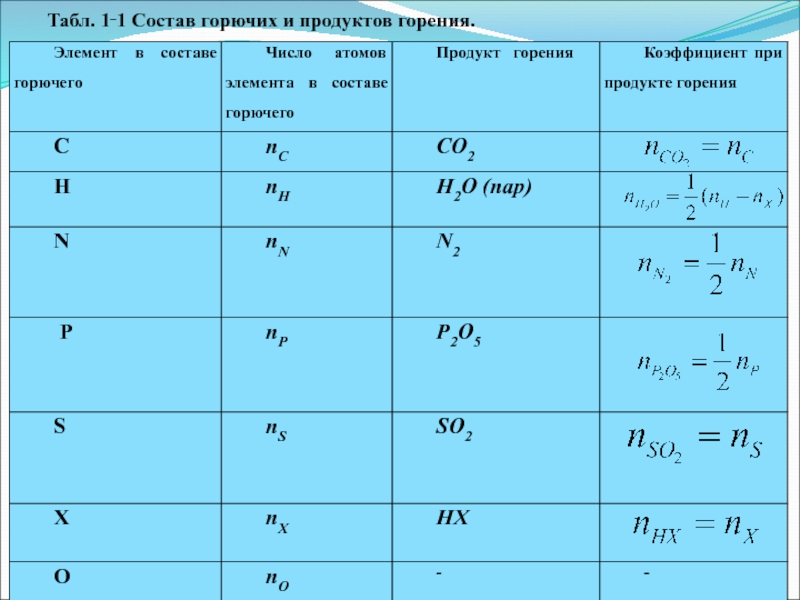 Слайд 3Табл. 1‑1 Состав горючих и продуктов горения.