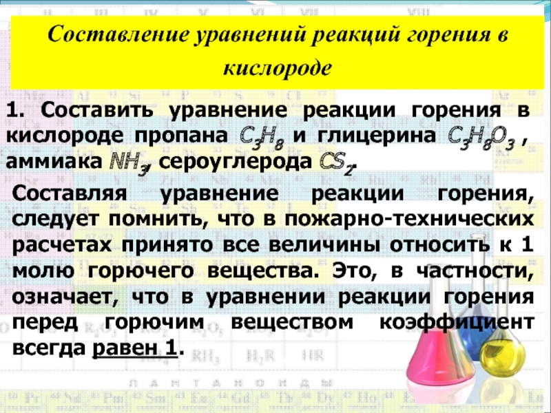Составляя уравнение реакции горения, следует помнить, что в пожарно-технических расчетах принято все величины относить к 1 молю горючего вещества. Это, в частности, означает, что в уравнении реакции горения перед горючим веществом коэффициент всегда равен 1.