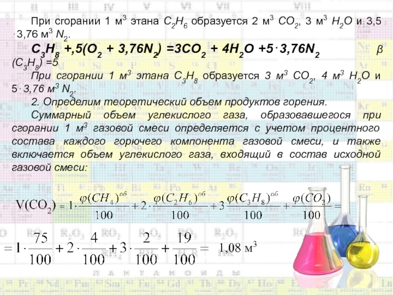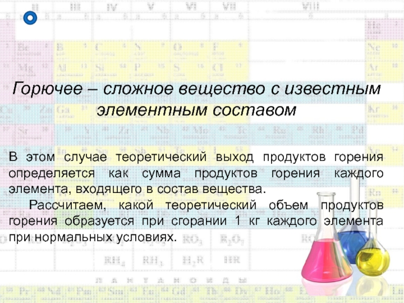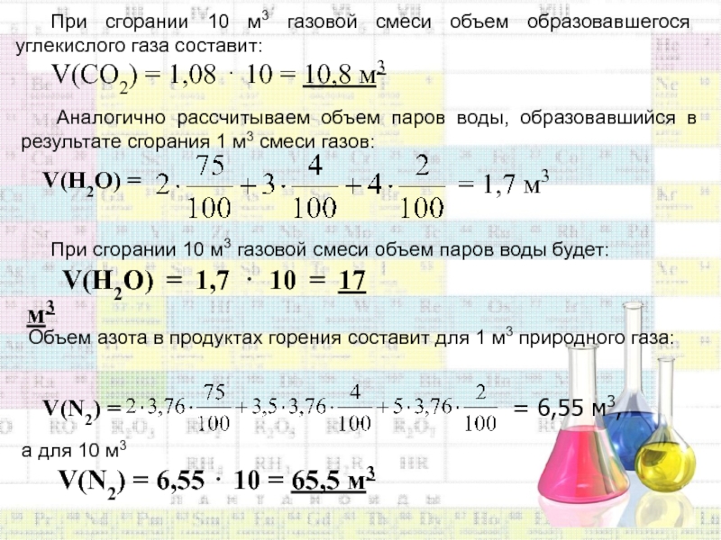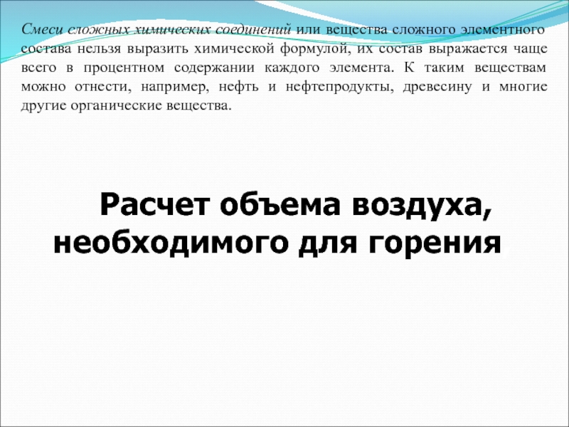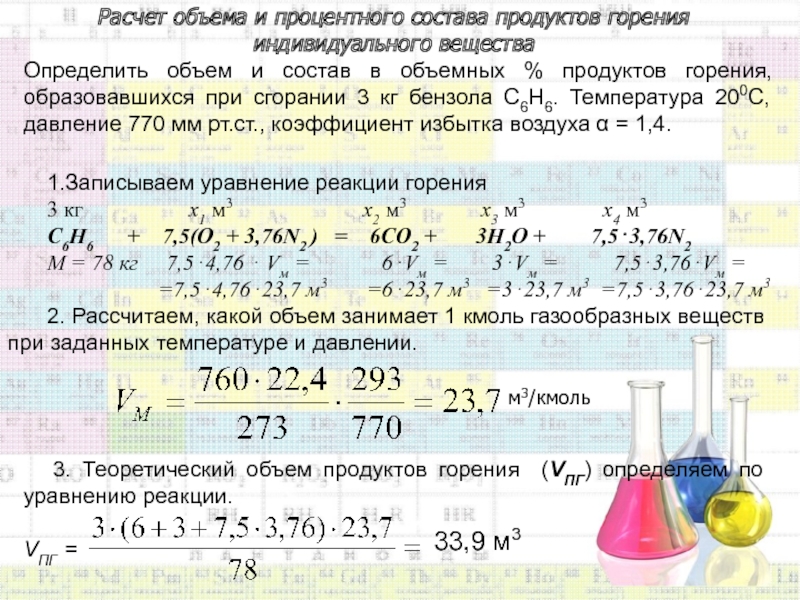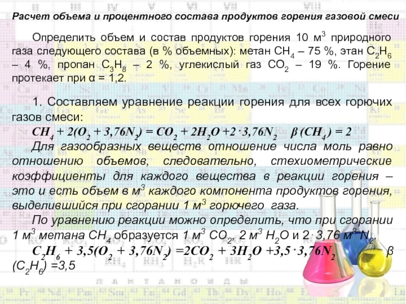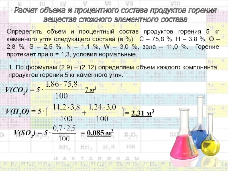 Слайд 51Расчет объема и процентного состава продуктов горения вещества сложного элементного