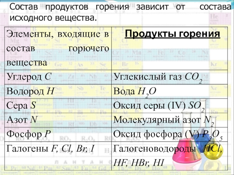 Слайд 6Состав продуктов горения зависит от состава исходного вещества.
