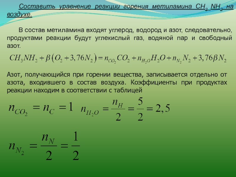 Слайд 13Составить уравнение реакции горения метиламина CH3 NH2 на воздухе.