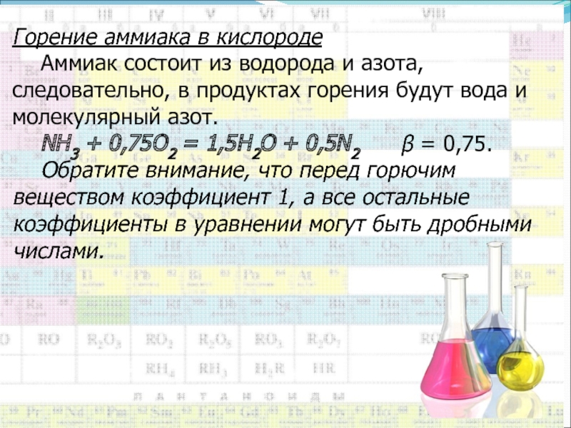 Обратите внимание, что перед горючим веществом коэффициент 1, а все остальные коэффициенты в уравнении могут быть дробными числами.