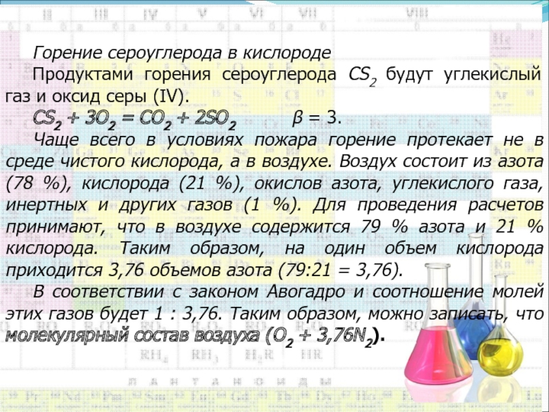 Чаще всего в условиях пожара горение протекает не в среде чистого кислорода, а в воздухе. Воздух состоит из азота (78 %), кислорода (21 %), окислов азота, углекислого газа, инертных и других газов (1 %). Для проведения расчетов принимают, что в воздухе содержится 79 % азота и 21 % кислорода. Таким образом, на один объем кислорода приходится 3,76 объемов азота (79:21 = 3,76).