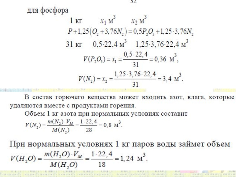 фосфора) и, поэтому из воздуха на горение будет израсходовано кислорода меньше на количество, которое содержалось в горючем веществе. Следовательно, в продуктах горения и азота будет меньше на количество, которое приходилось бы на кислород, если бы он находился не в горючем веществе, а в воздухе.