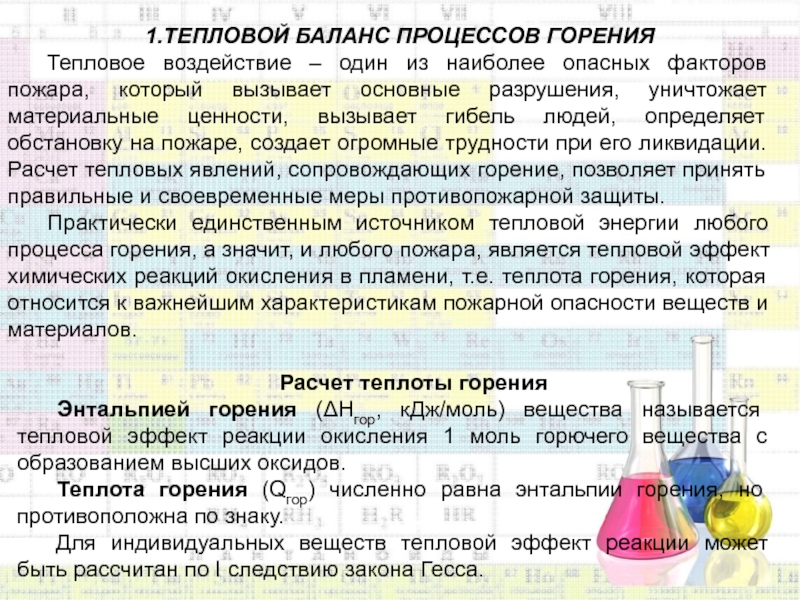 гибель людей, определяет обстановку на пожаре, создает огромные трудности при его ликвидации. Расчет тепловых явлений, сопровождающих горение, позволяет принять правильные и своевременные меры противопожарной защиты.