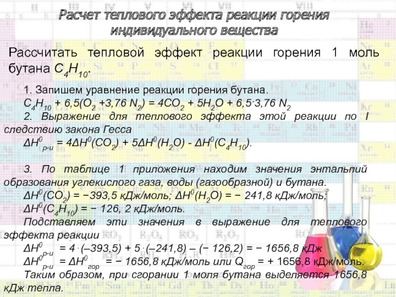 Слайд 55Расчет теплового эффекта реакции горения индивидуального вещества