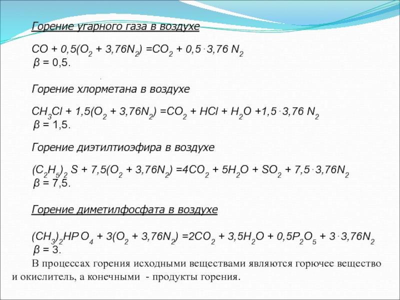 СН3Сl + 1,5(О2 + 3,76N2) =СО2 + НСl + Н2О +1,53,76 N2