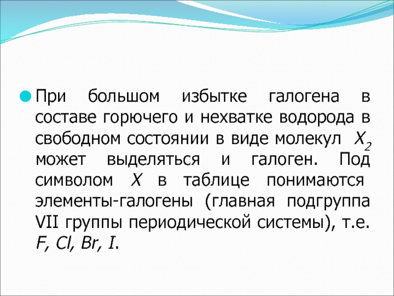 Слайд 4При большом избытке галогена в составе горючего и нехватке водорода
