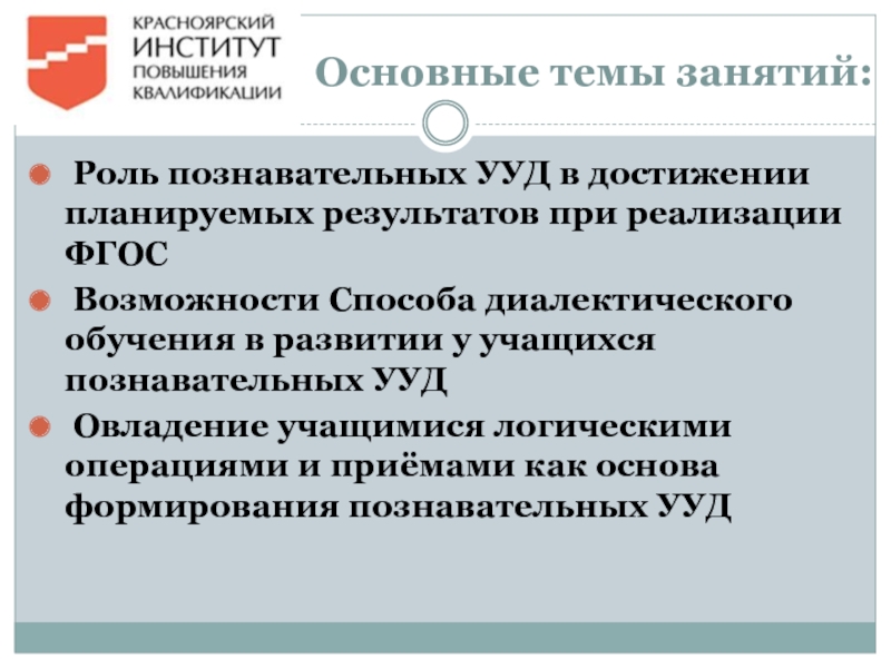 Основные темы занятий: Роль познавательных УУД в достижении планируемых результатов при реализации ФГОС Возможности Способа диалектического обучения