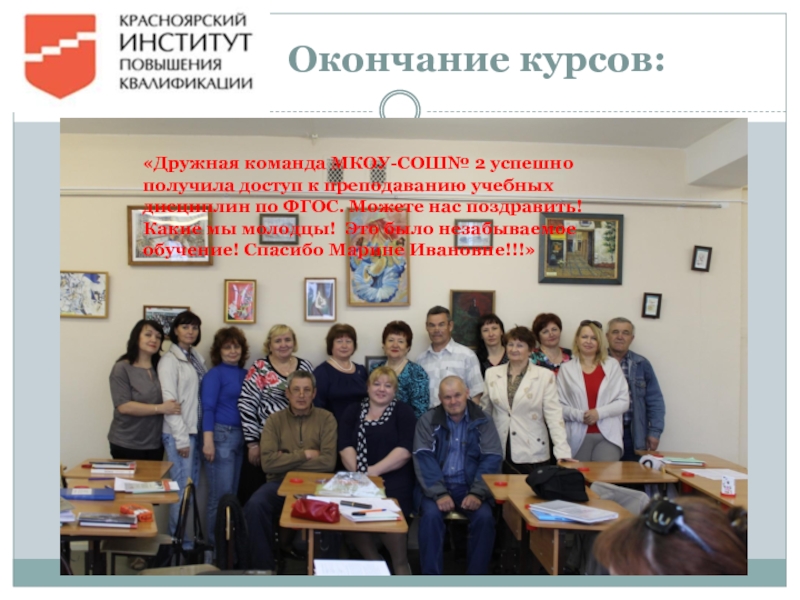 Окончание курсов:«Дружная команда МКОУ-СОШ№ 2 успешно получила доступ к преподаванию учебных дисциплин по ФГОС. Можете нас поздравить!