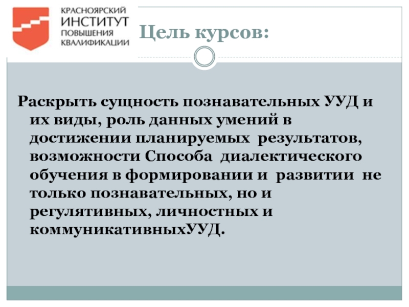 Цель курсов:Раскрыть сущность познавательных УУД и их виды, роль данных умений в достижении планируемых результатов, возможности Способа