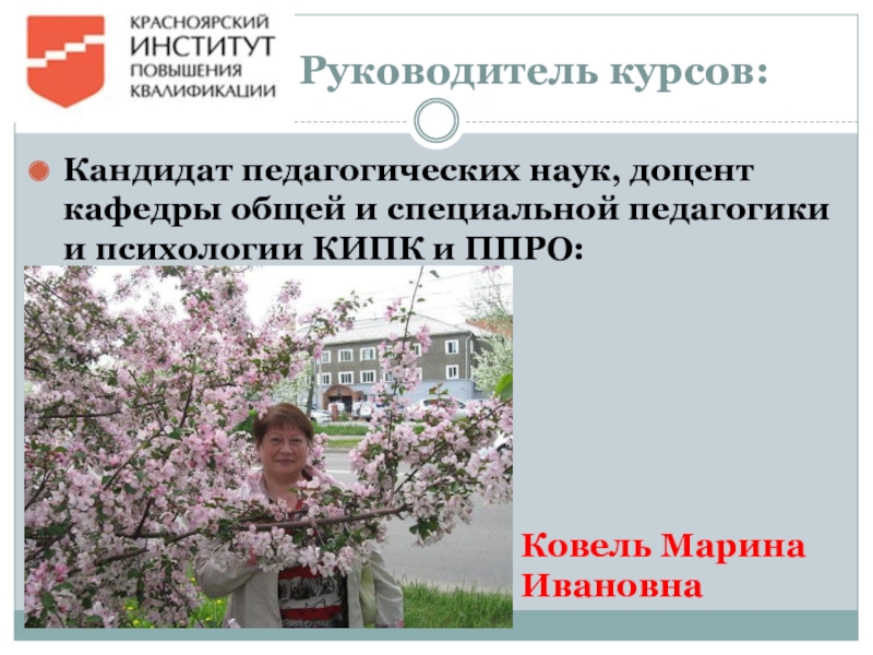 Руководитель курсов:Кандидат педагогических наук, доцент кафедры общей и специальной педагогики и психологии КИПК и ППРО:Ковель Марина Ивановна