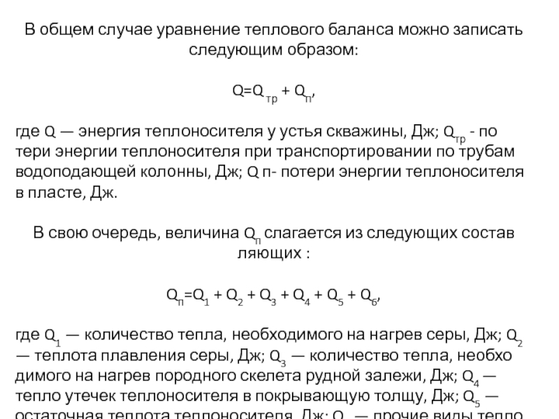 где Q1 — количество тепла, необходимого на нагрев серы, Дж; Q2 — теплота плавления серы, Дж; Q3 — количество тепла, необходимого на нагрев породного скелета рудной залежи, Дж; Q4 — тепло утечек теплоносителя в покрывающую толщу, Дж; Q5 — остаточная теплота теплоносителя, Дж; Q6 — прочие виды тепловых потерь, Дж.