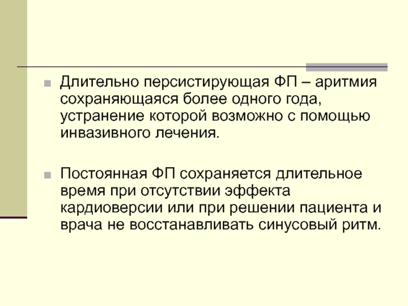 Слайд 9Длительно персистирующая ФП – аритмия сохраняющаяся более одного года, устранение