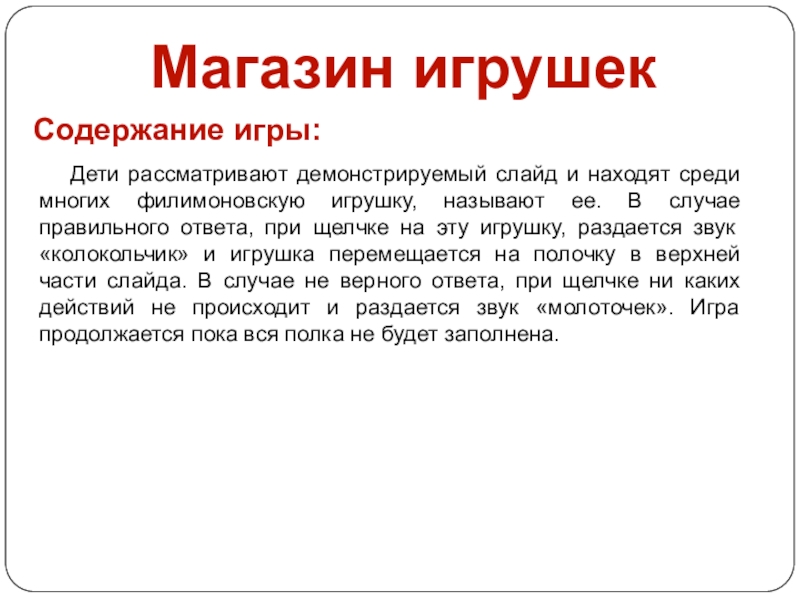 на эту игрушку, раздается звук «колокольчик» и игрушка перемещается на полочку в верхней части слайда. В случае не верного ответа, при щелчке ни каких действий не происходит и раздается звук «молоточек». Игра продолжается пока вся полка не будет заполнена.