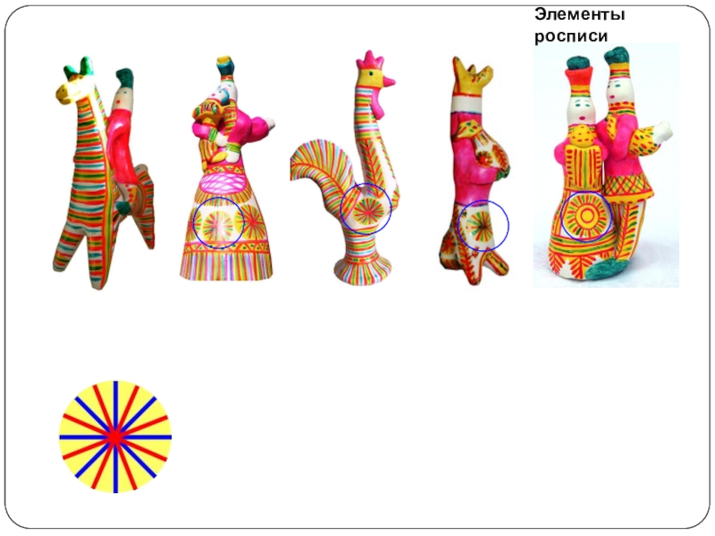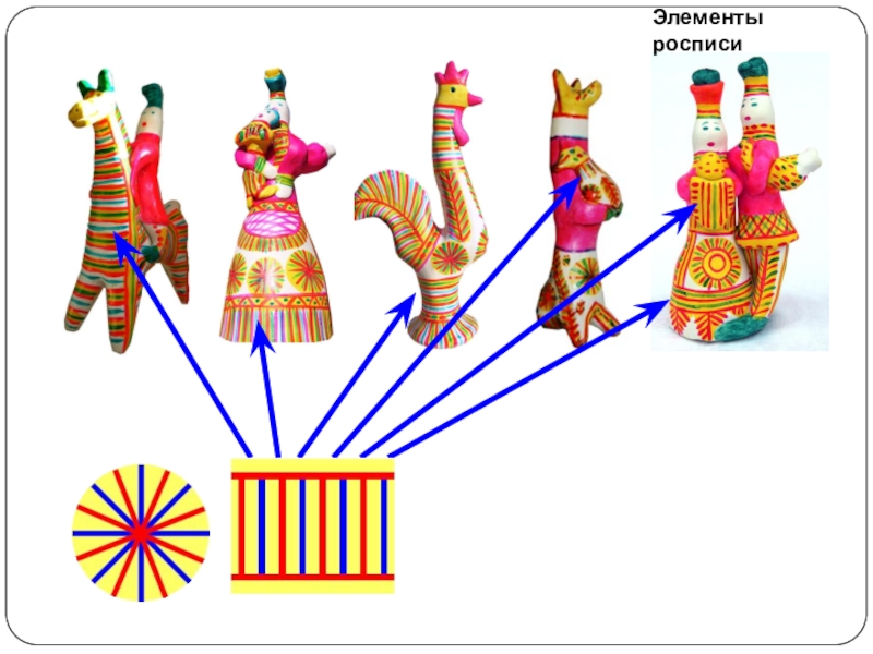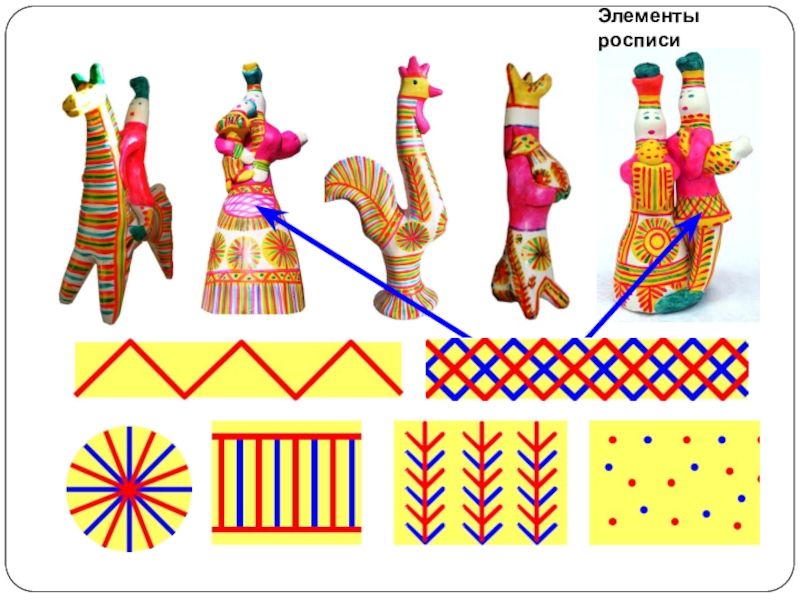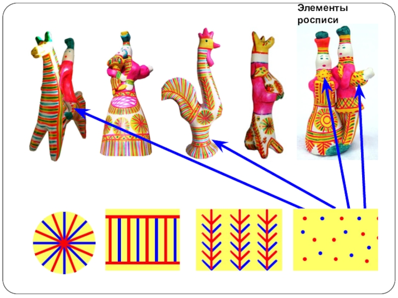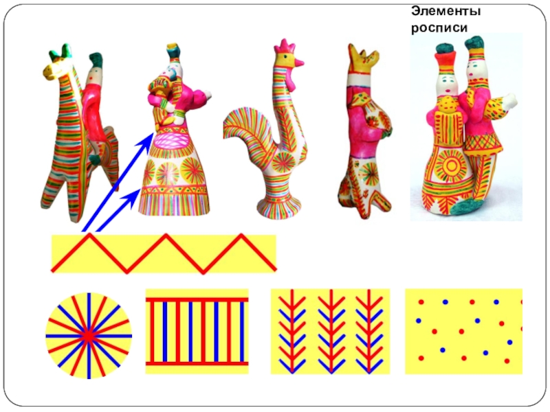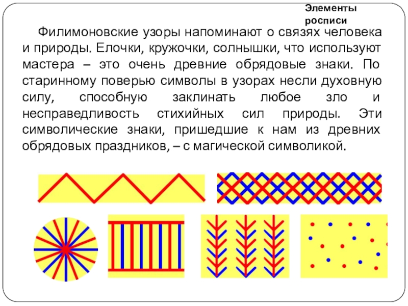 Слайд 24Филимоновские узоры напоминают о связях человека и природы. Елочки, кружочки,