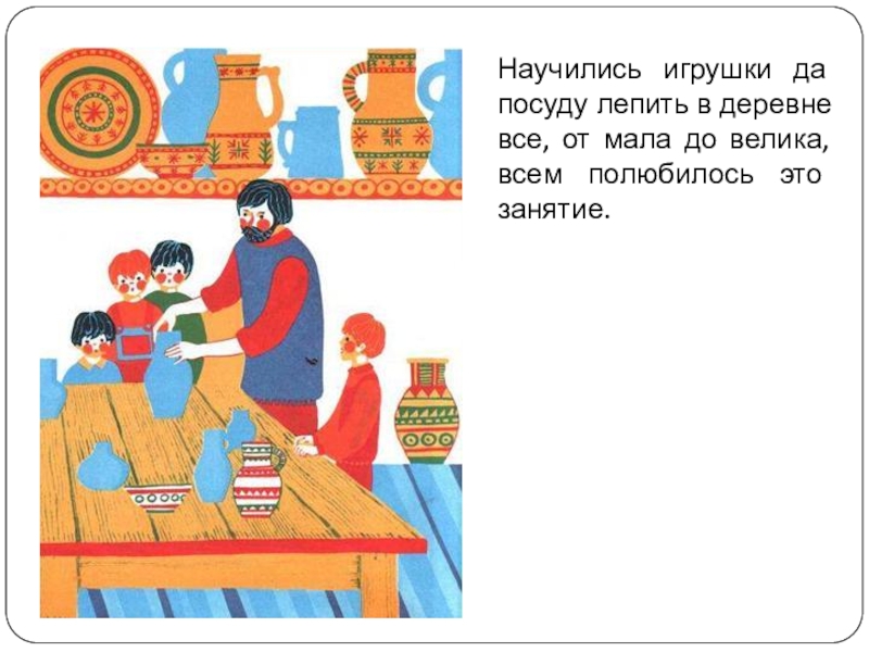 Слайд 10Научились игрушки да посуду лепить в деревне все, от мала