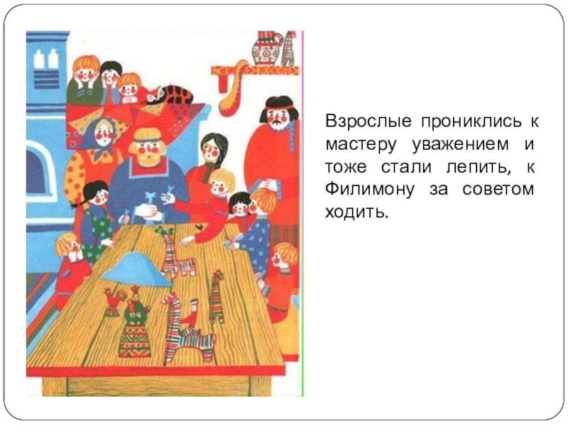 Слайд 9Взрослые прониклись к мастеру уважением и тоже стали лепить, к